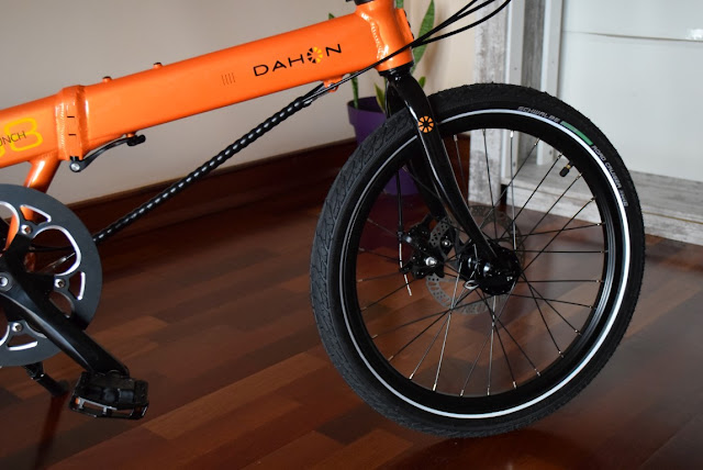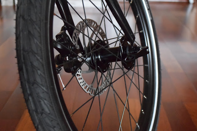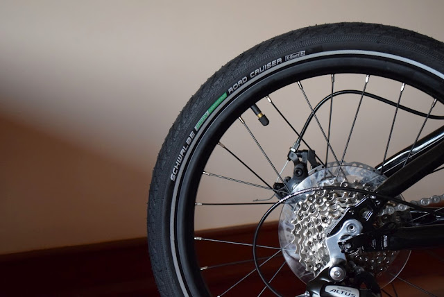 Os pneus são os Road Cruiser da Schwalbe, com protecção antifuro. Os aros de parede dupla com acabamento preto mate e para disco (sem a banda cnc para vbrake)