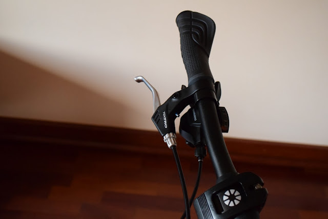 Punhos ergonómicos, manetes de 2 dedos Tektro, aperto do guiador é o extra largo mais fácil de operar.