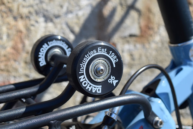 O tradicional suporte traseiro ganhou 4 rodinhas para que a bicicleta pouse facilmente e a possamos empurrar como se fosse um trolley