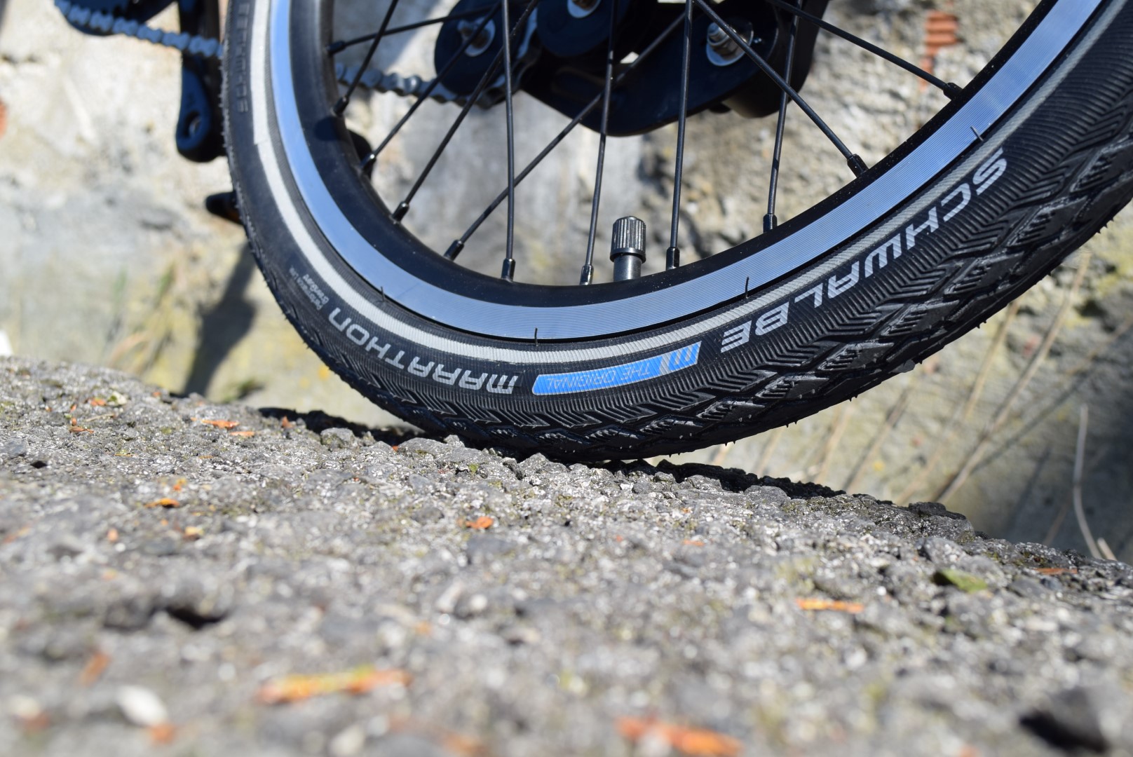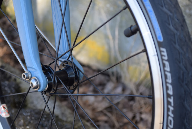 Rodas com aros de parede dupla e pneus Schwalbe Marathon de 35mm que dispensam apresentações. Anti-furo, alta pressão. O melhor para esta medida