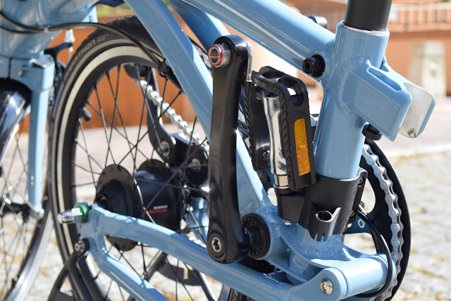 A dobradiça é realmente muito robusta e há um reduzido contacto entre partes, tal como acontece na dobradiça V-Clamp que encontramos nas DAHON Mu, Vigor,etc. Neste caso esta utiliza uma mecânica muito parecida com a do espigão de guiador Radius. Aquela língua prata entra na outra parte da dobra.