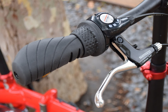 Voltando ao cockpit, para alem de um melhor aperto em vermelho anodizado, as manetes são muito boas, da Shimano e o guiador ergonómico, tal como os punhos que se apertam com um parafuso interior. Este espigão dobrável ao contrário da versão anterior já é telescópico e pode regular a altura.