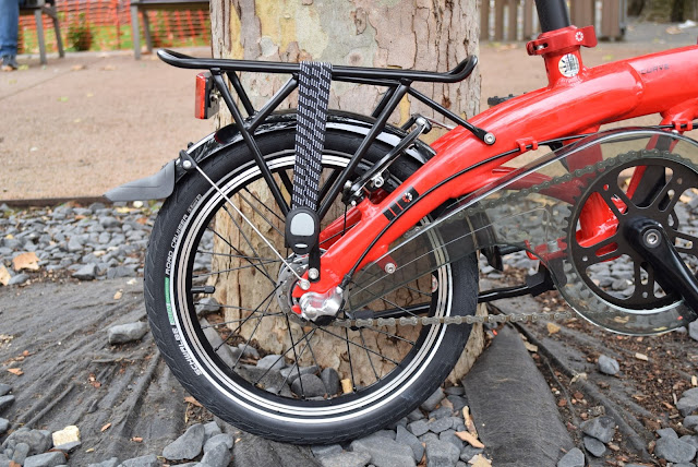 Os pneus escolhidos foram uns Schwalbe Big Apple. De origem trazia uns Road Cruiser que não eram nada maus, mas estes são melhores, com mais protecção antifuro e efeito suspensão em baixa pressão, sem comprometer a rolagem. No segmento das rodas 16" (etrto 305) estes são sem dúvida os melhores pneus. Outro pneu interessante é o Marathon Racer 16 x 1.50 para quem quer um pouco mais de rolagem e menos peso.