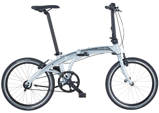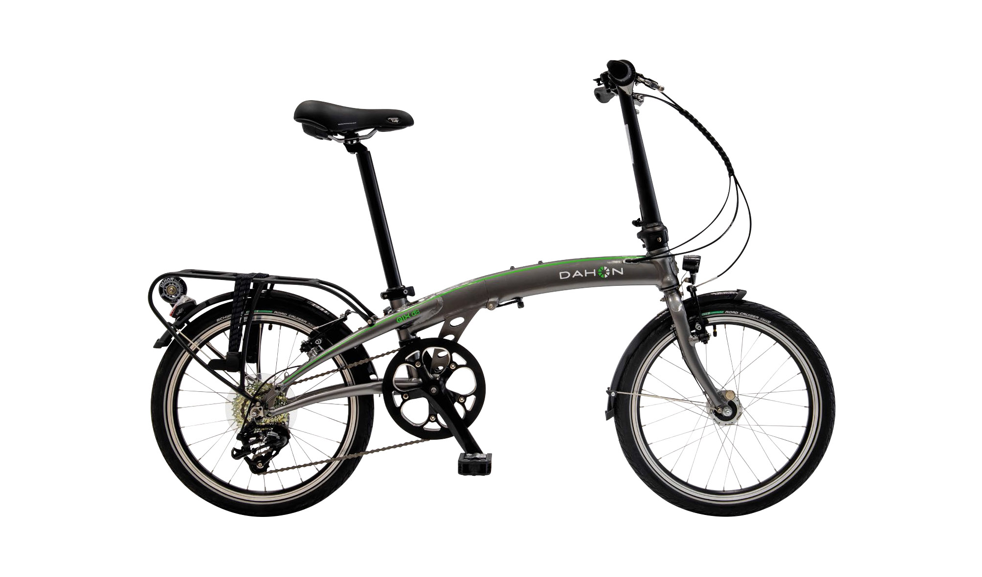 A Dahon de dobragem vertical desta vez mais completa. Com iluminação completa a dínamo de cubo, pneus antifuro, g.lamas, o característico suporte com rodinha para empurrar e uma slot frontal para cargas.