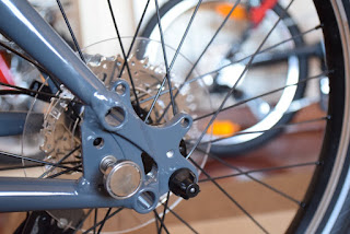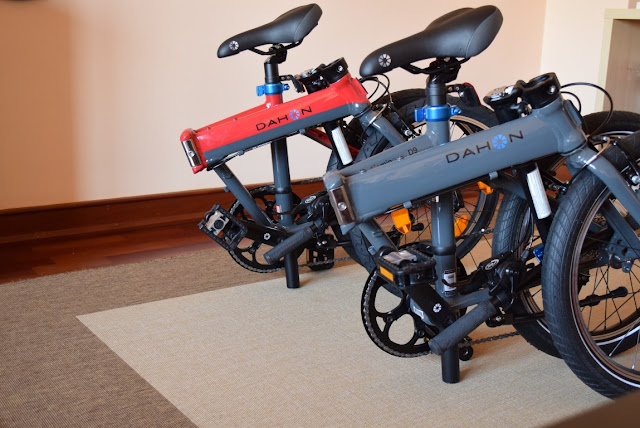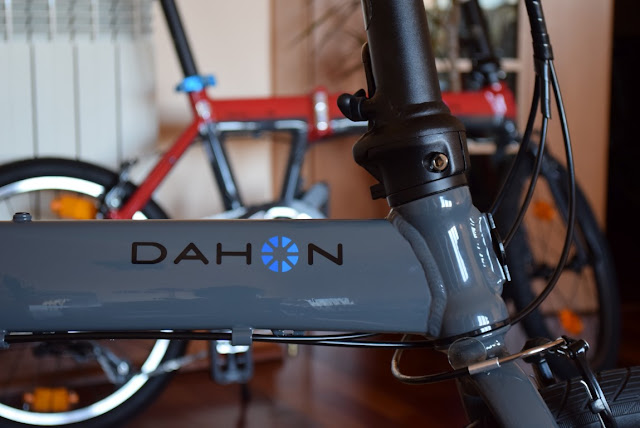 Ambas trazem estes bonitos apertos (espigão de selim e guiador respectivamente) que combinam com o logótipo DAHON em azul. As manetes de travão são umas Avid muito robustas e as pinças de travão e calços Promax.