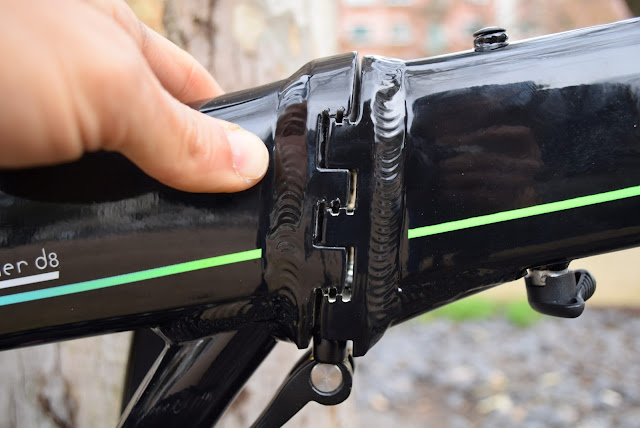 O sistema é realmente muito idêntico ao LockJaw da Dash, o princípio é o mesmo mas aplicado numa base de conexão maior. 3 níveis com 2 dentes em baixo que encaixam nos 2 dentes de cima. As duas partes do quadro são desniveladas, não é diferente do habitual, há sempre uma pequena folga, neste caso um pouco maior, mas tem uma mola. Ao apertares o eixo do meio (que também tem uma mola) empurra a metade da frente para cima.