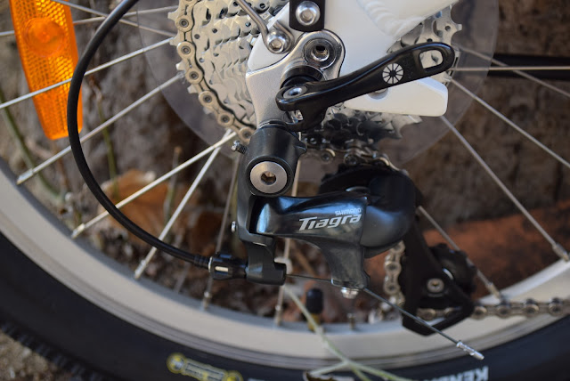 Os componentes são uma mistura de gama média/alta, dependendo do modelo, sendo que este que fotografei, D10, destaca-se pela transmissão Shimano Tiagra de 10 velocidades, rodas super leves com aros de dupla parede, quadro totalmente branco e com detalhes em laranja.