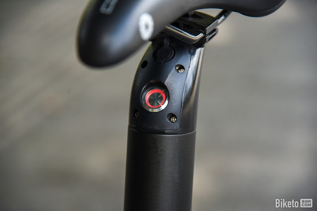 A ligação do "espigão bateria" é feita por um cabo flexível. A bateria é de 36v, 8.7Ah (313Wh) de células Samsung. Autonomia até 80km