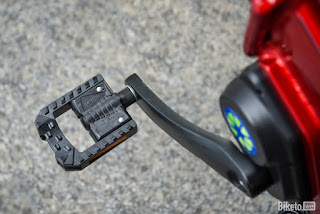 A cassete tem boa amplitude (11-32) e o prato pedaleiro é enorme, com 56 dentes, com protecção. Portanto grande performance, mas também óptimo para subidas íngremes juntamente com o motor.