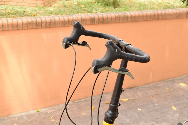 O guiador bullhorn da Kinetix, já com uma fita nova montada. Aliás é o guiador (e a cor amarela) que se destacam do conjunto. Quem não conhece bicicletas é a primeira coisa em que repara.