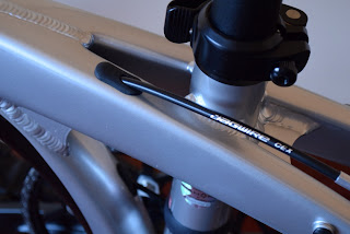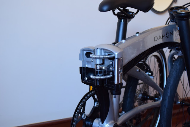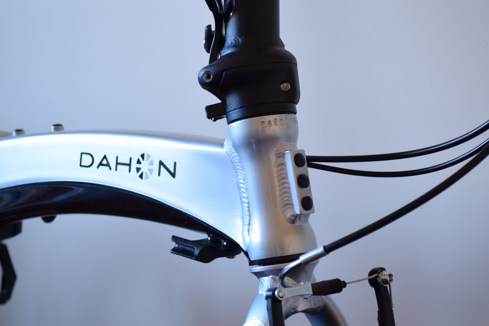 A passagem interna de cabos, característica das altas gamas Dahon. Cabos/espirais da Jagwire específico para DAHON. A dobradiça é a V-Clamp, que permite menos contacto entre as duas partes, evitando assim mais vibrações.