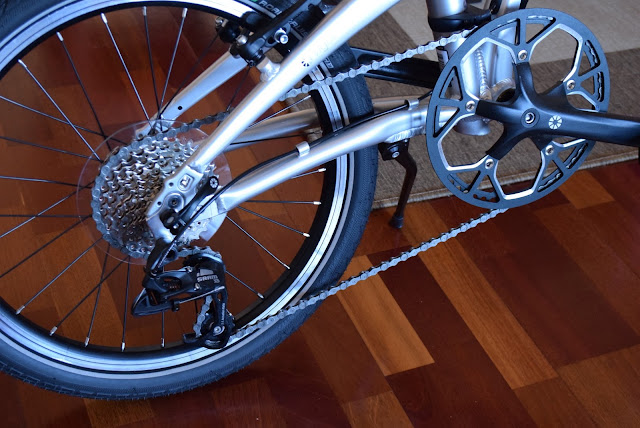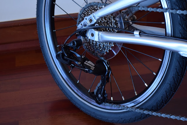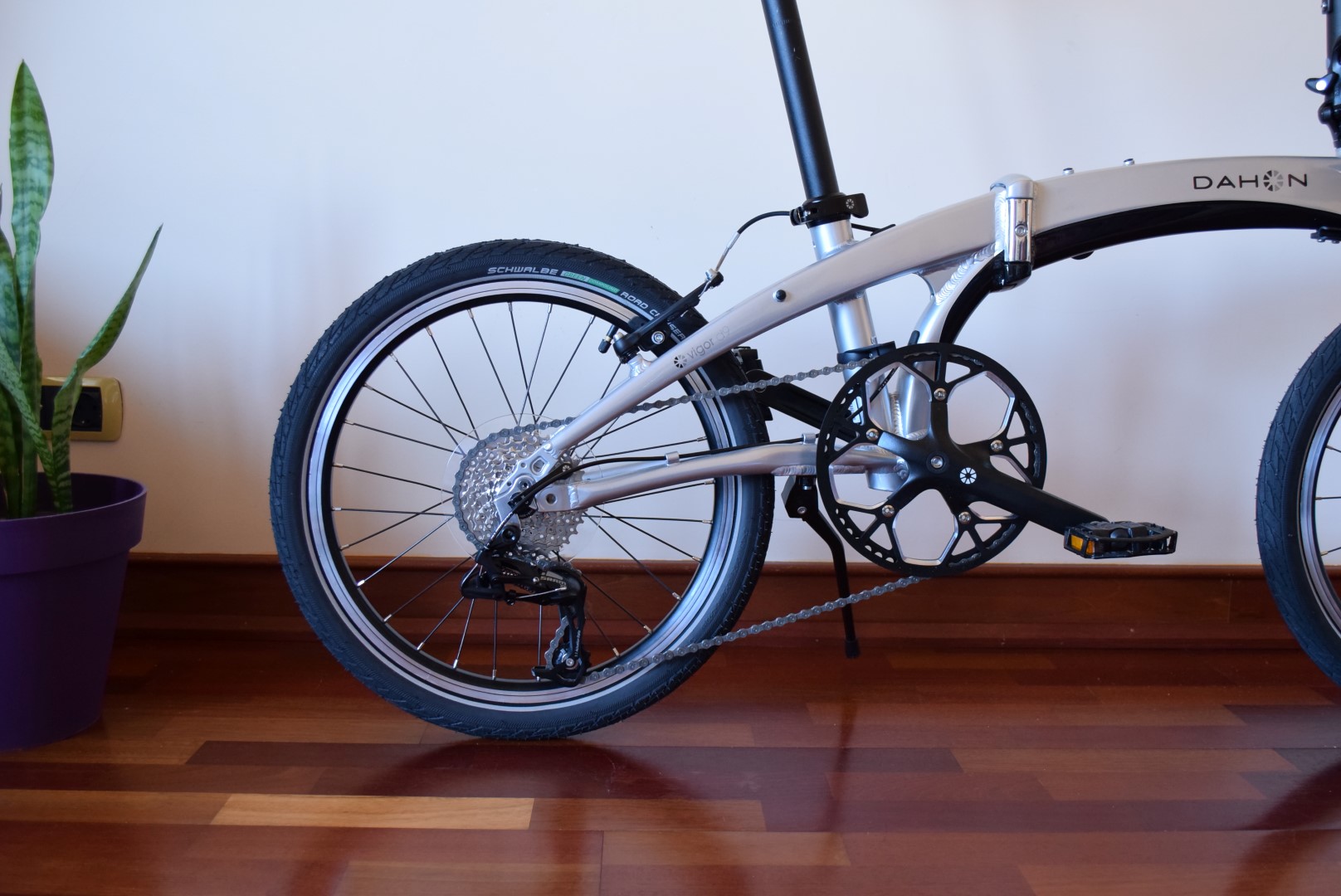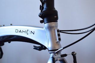 Com um quadro em alumínio de parede interna reforçada (Dalloy), hidroformado e escora traseira oferece um pouco mais de robustez a troco de mais umas gramas em relação à mais conhecida DAHON MU.