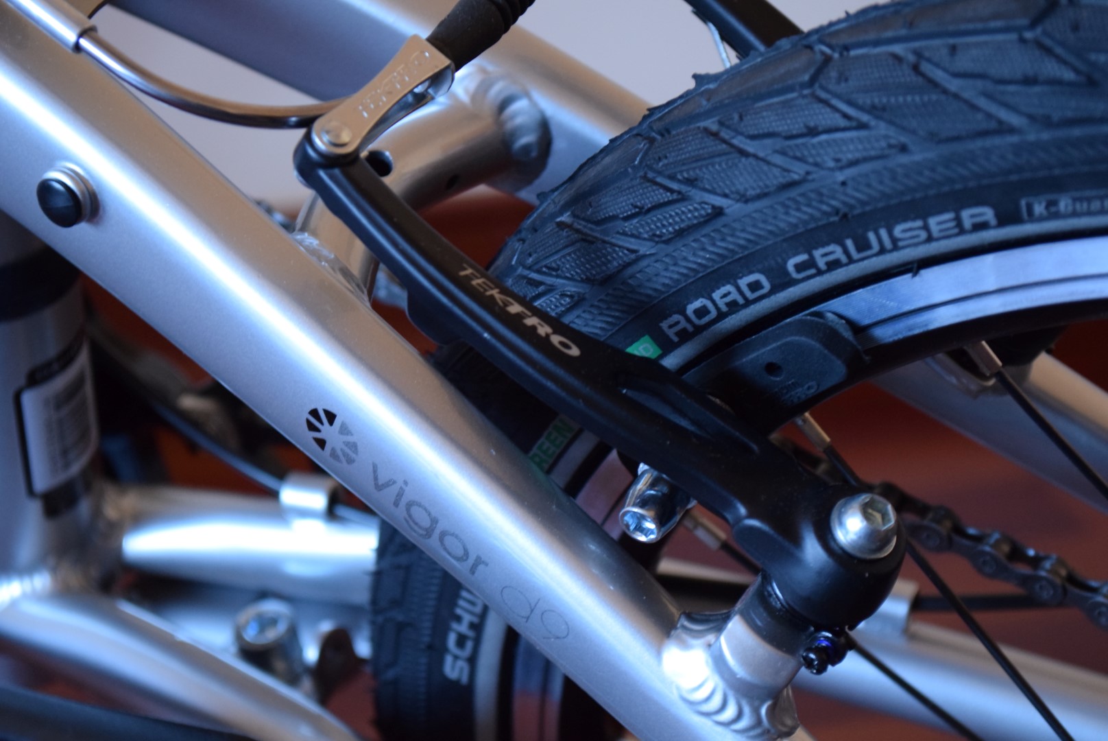 Travões Tektro precisos e pneus Schwalbe Road Cruiser com faixa reflectora e anti furo.