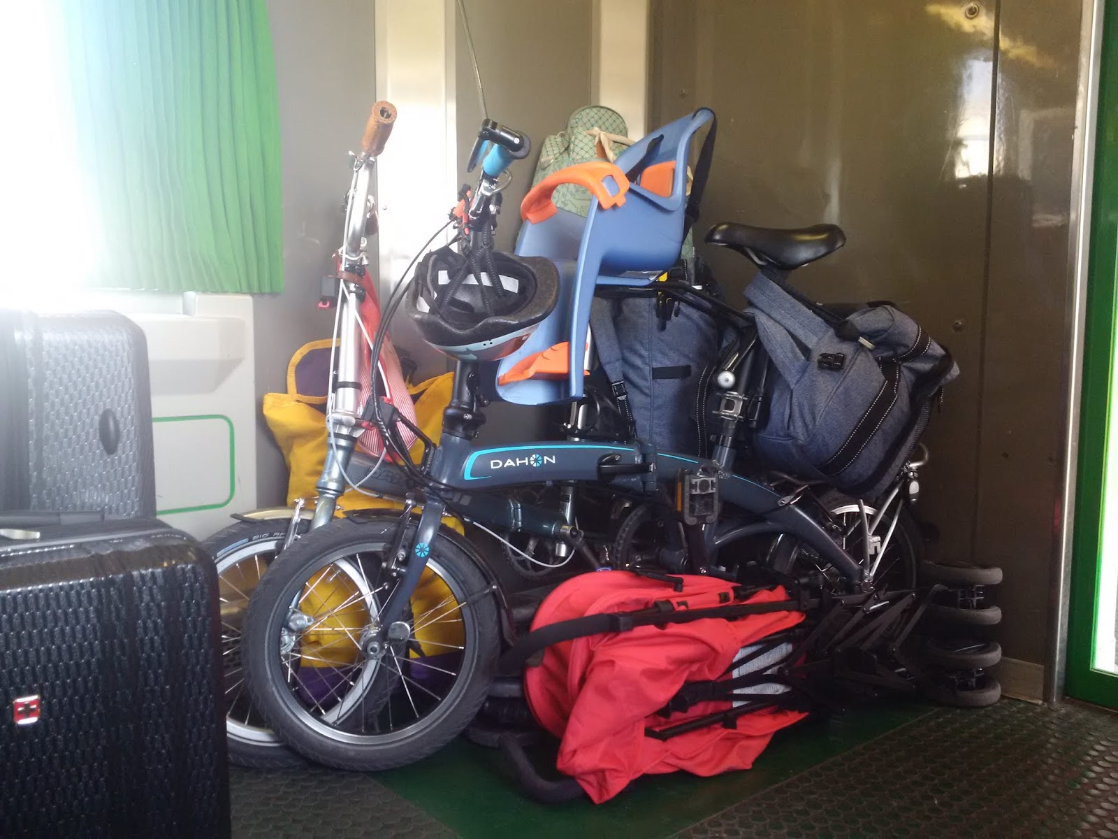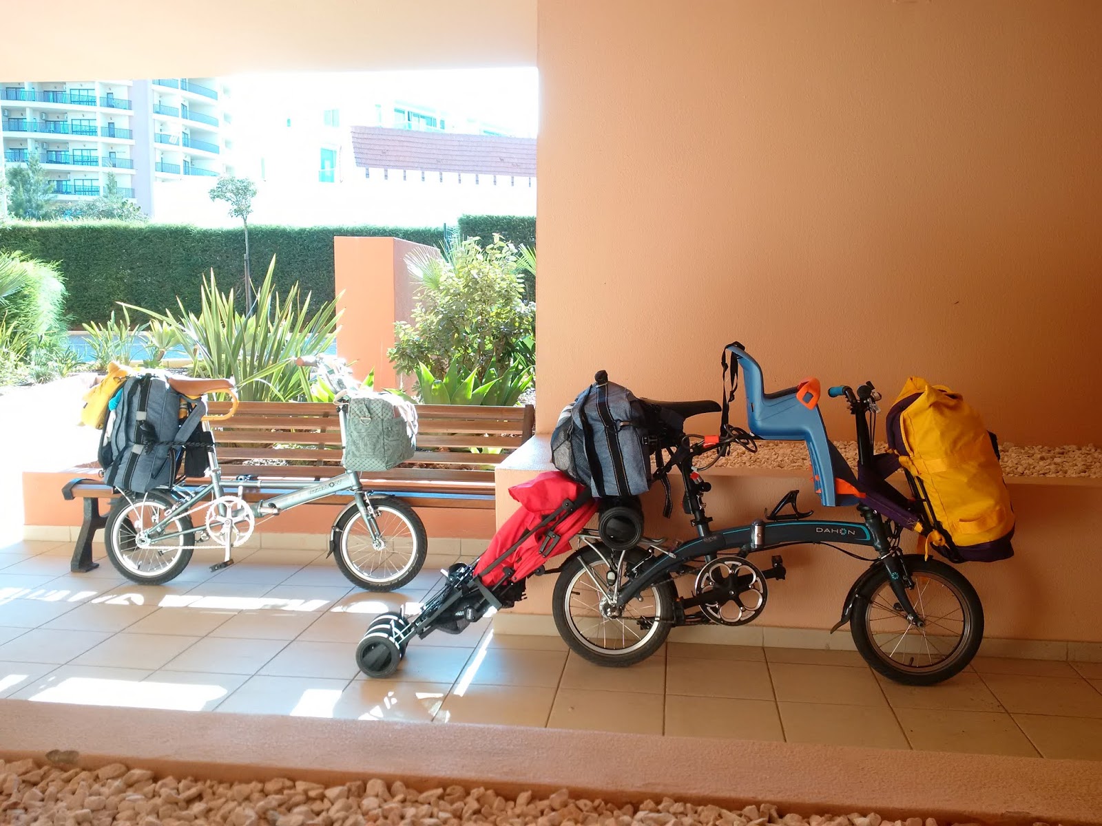 Decidimos também optar pelas nossas Curve e Piccolo de roda 16, as mais compactas, para podermos ter a liberdade de apanhar um taxi ou autocarro sempre que fosse necessário. Sobre a bagagem, dividimos tudo em 4 malas médias. Tínhamos também o carrinho dele que funciona muito bem como atrelado. Aproveitamos logo essa vantagem no início porque o menino chegou a Portimão a dormir e apanhamos um taxi (tipo familiar) .
