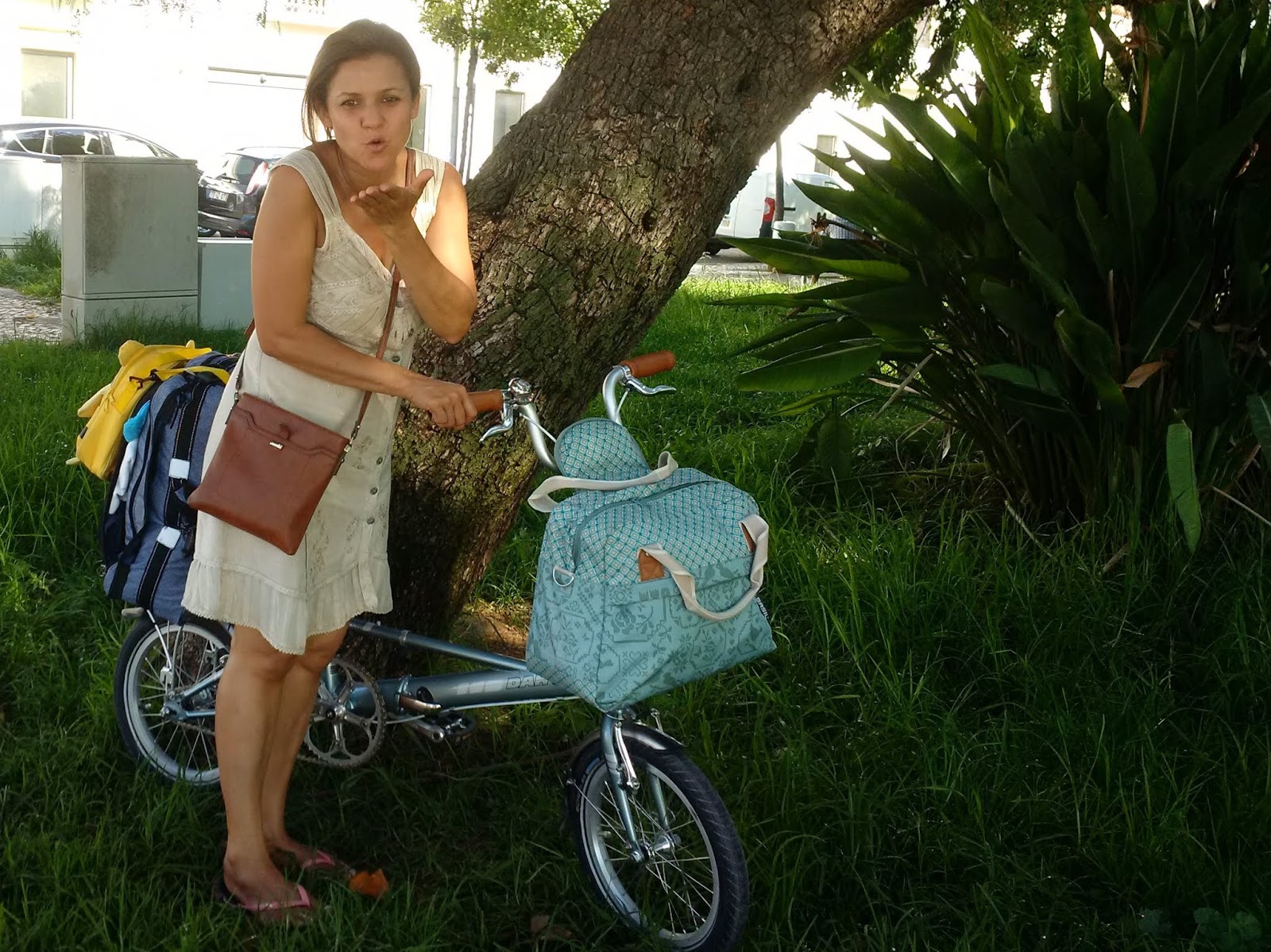 As duas malas mais pesadas ficaram na traseira, o mais afastadas possível para não se bater com os pés. À frente um adaptador Klickfix mais um saco Basil turquesa (Boheme Carry All) modificado para encaixar no adaptador que leva até 7 ou 8kgs e na Curve um Klickfix + Vario que não interfere na direcção + um saco da Bashô.