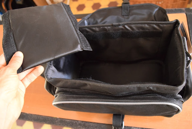 A parte interior da mala, escondida por baixo de uma aba com velcro.